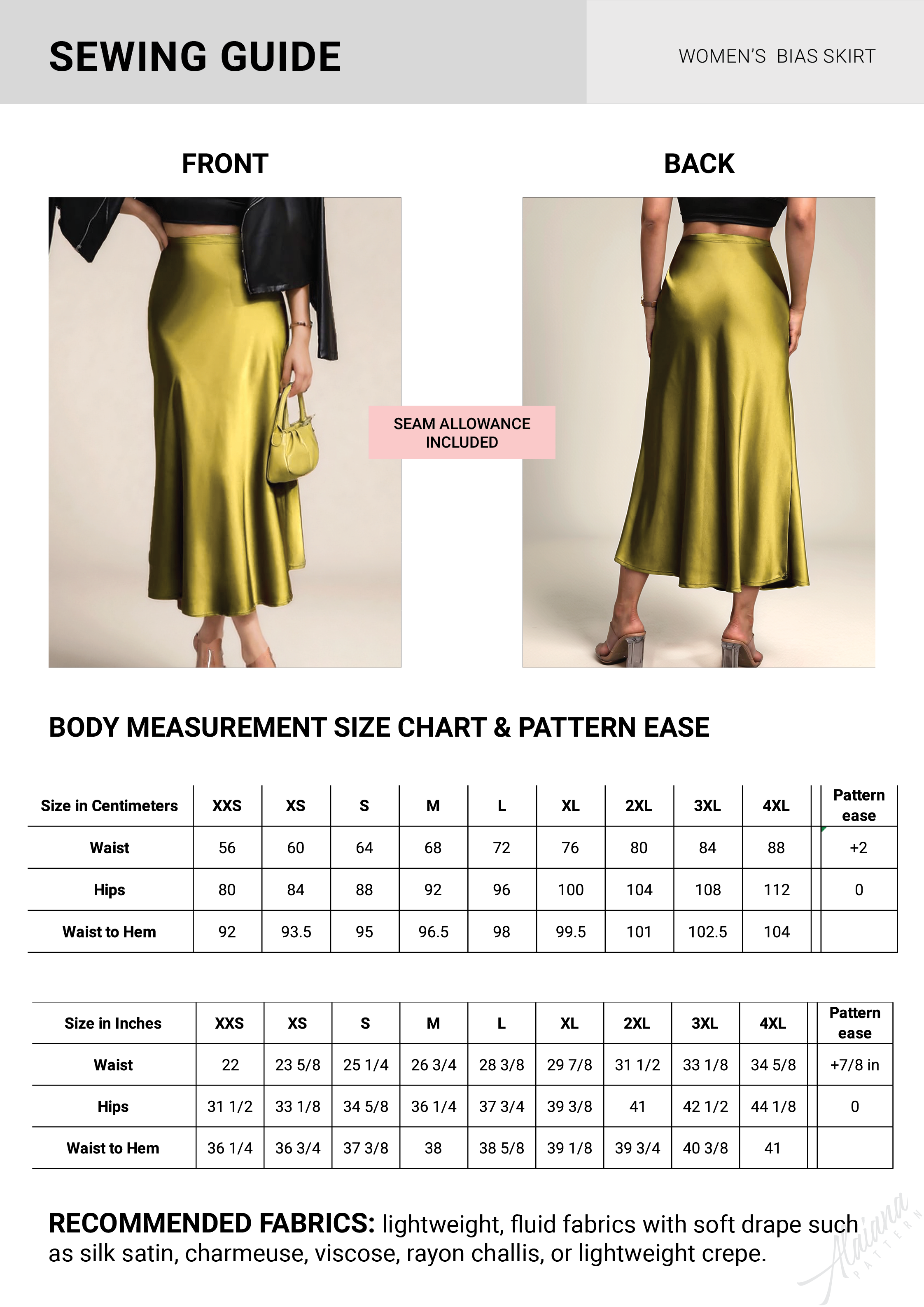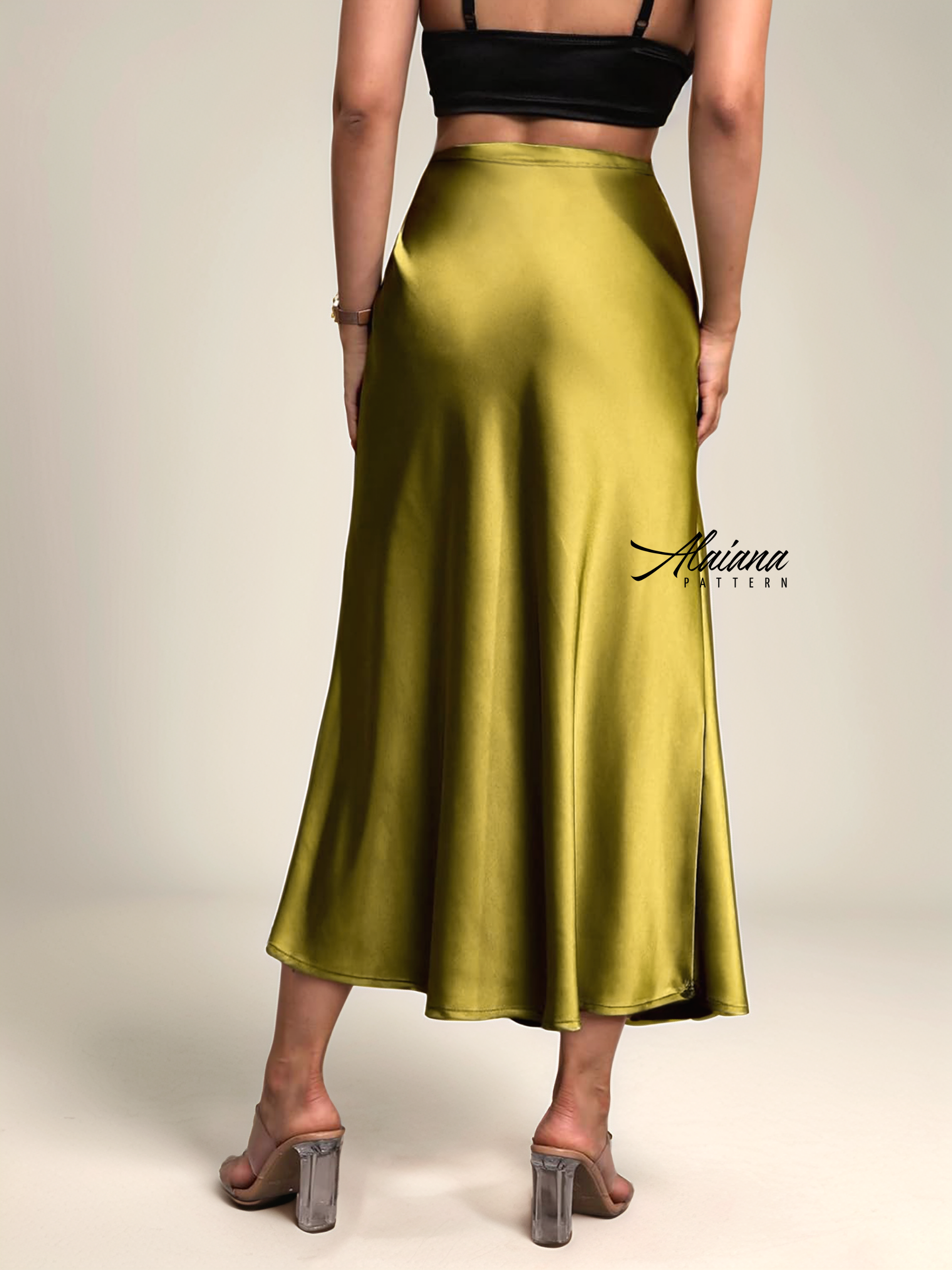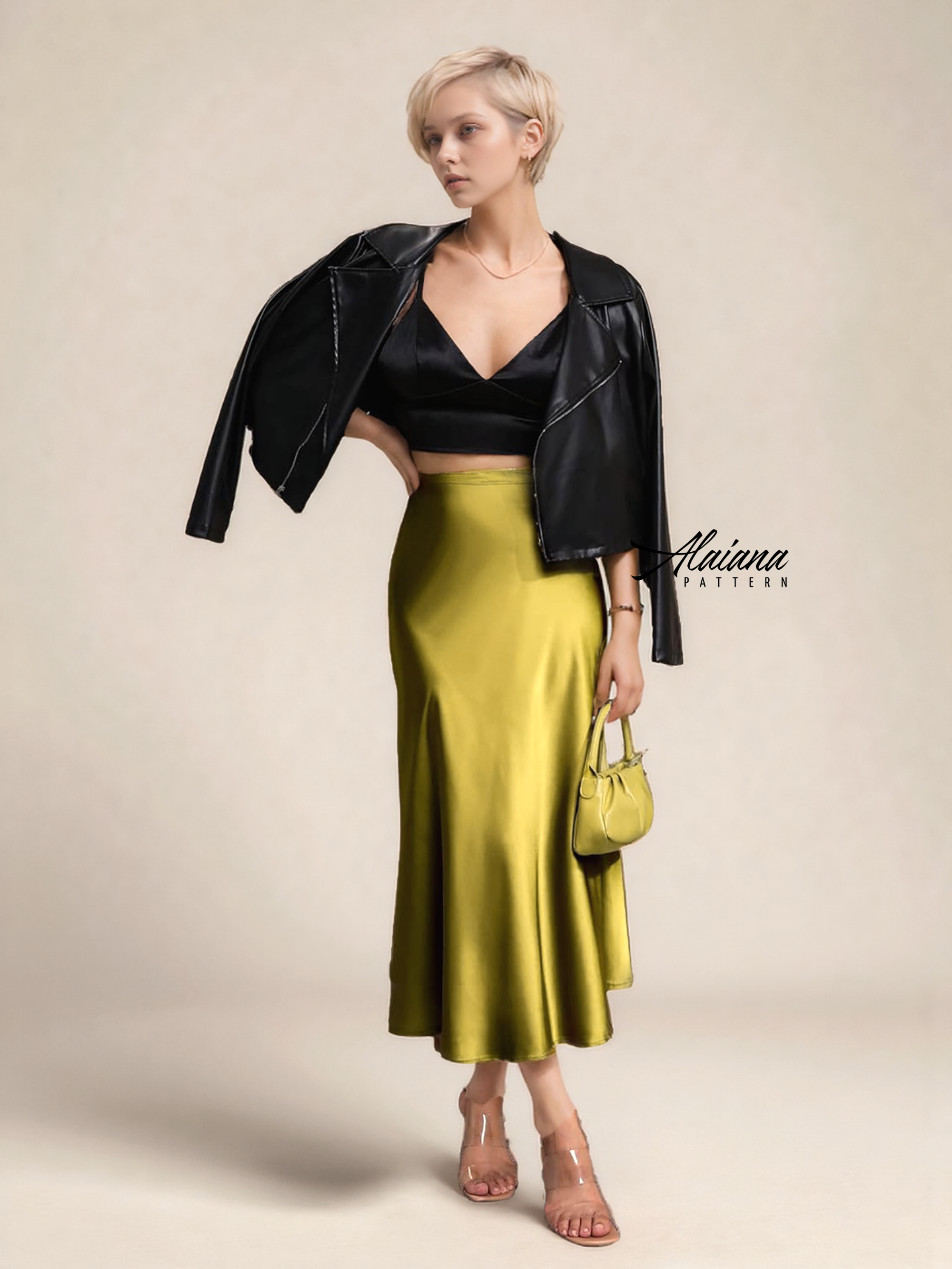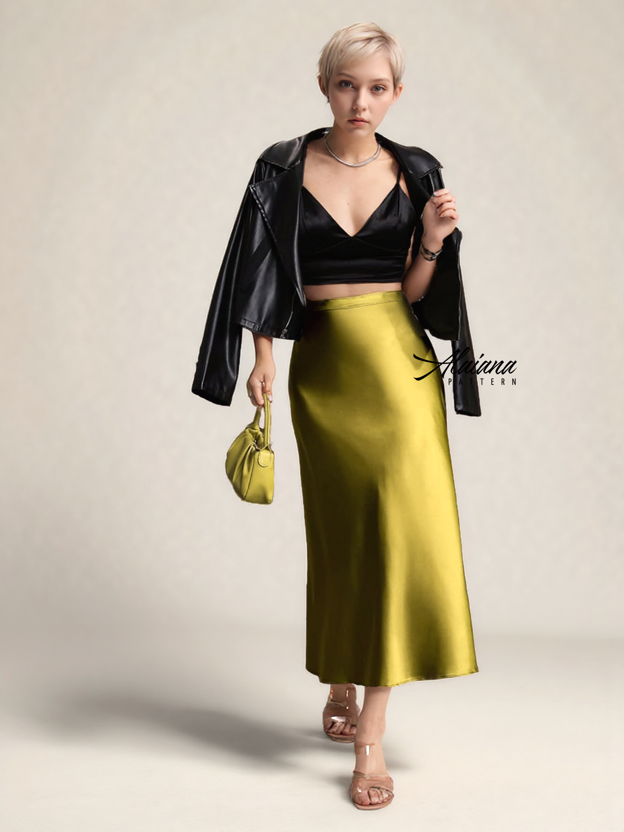 Sew your own elegant bias cut skirt with this beginner-friendly digital sewing pattern by Alianna Pattern. Designed for fluid drape and timeless femininity. Perfect for special occasions or everyday glam, this skirt pairs effortlessly with crop tops, leather jackets, or evening blouses.